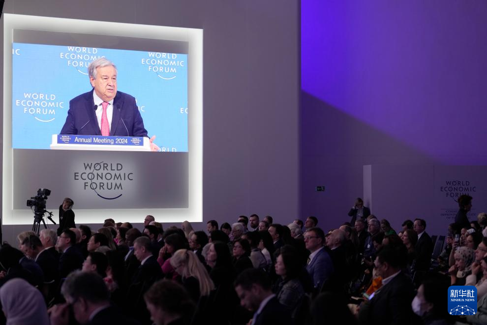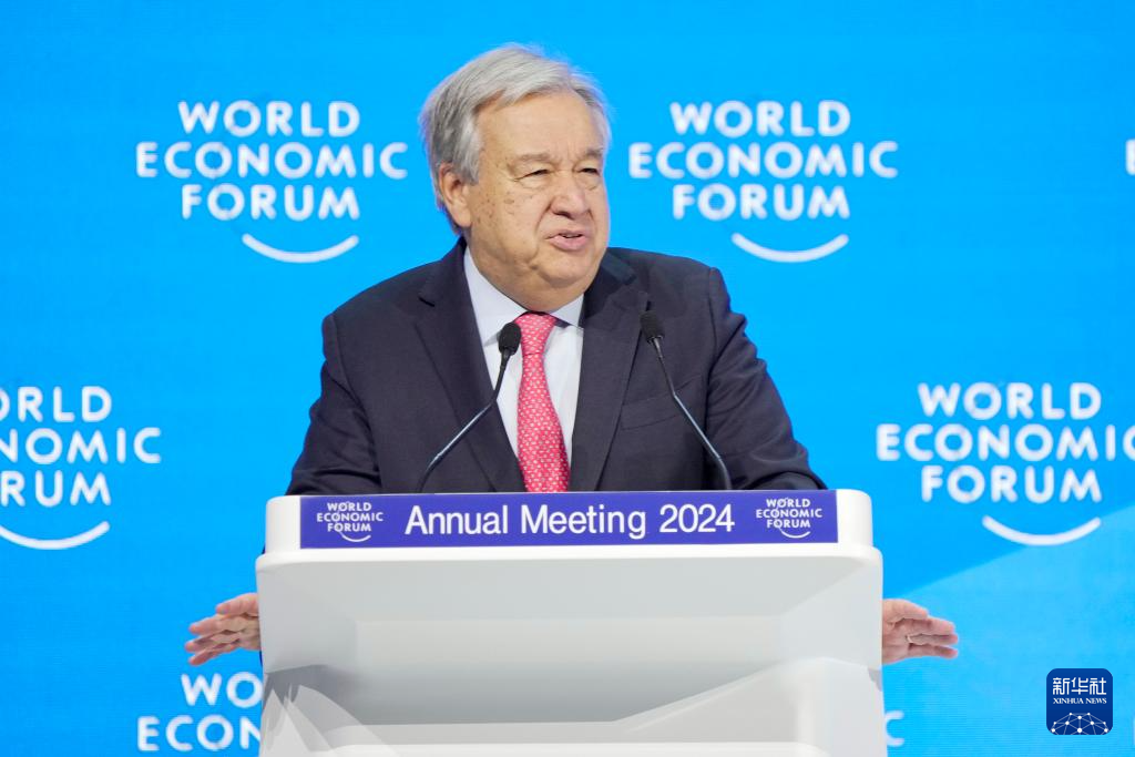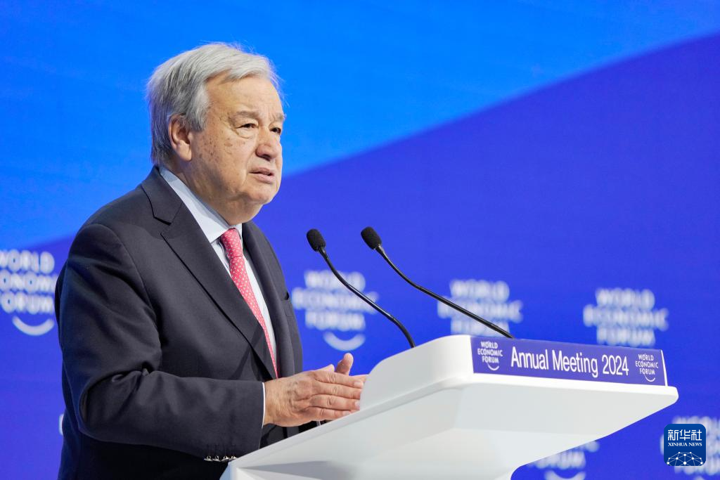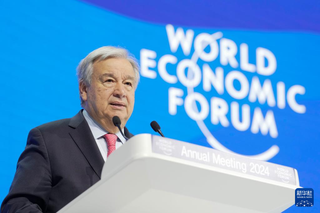 1月17日,联合国秘书长古特雷斯在瑞士达沃斯举行的世界经济论坛2024年年会上致辞。
