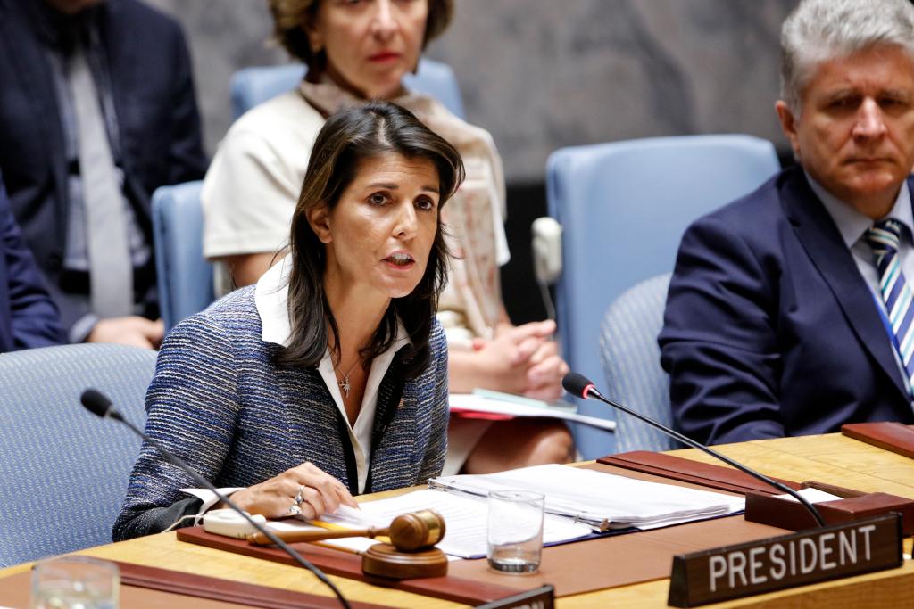 图为2018年9月5日时任美国常驻联合国代表的黑莉(左)在位于纽约的联合国总部主持安理会会议的资料照片。新华社记者李木子摄