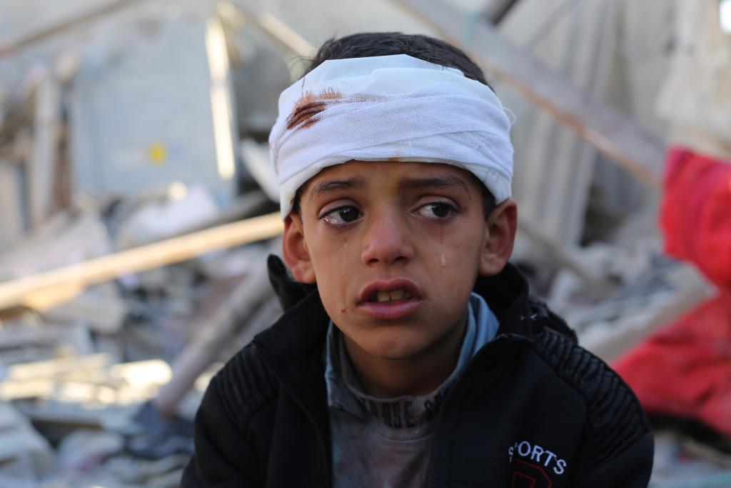 1月18日,在加沙地带南部城市拉法,一名受伤的男孩在哭泣。新华社发(哈立德·奥马尔摄)