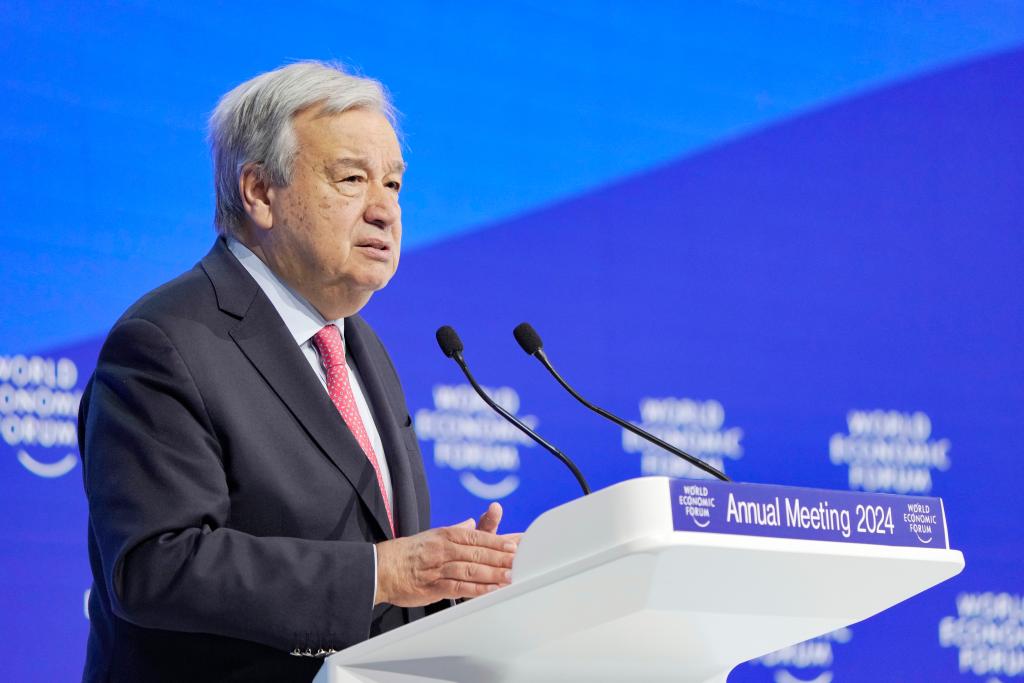 1月17日,联合国秘书长古特雷斯在瑞士达沃斯举行的世界经济论坛2024年年会上致辞。新华社发(世界经济论坛供图)