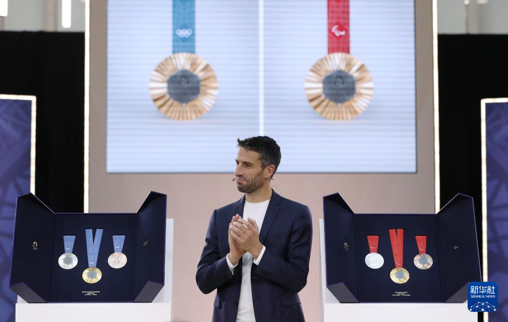 2月8日,巴黎奥组委主席托尼·埃斯坦盖(中)在巴黎奥运会及残奥会奖牌发布仪式上。