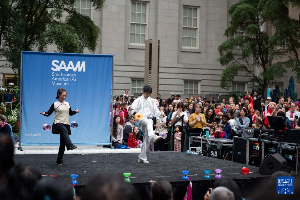 2月10日,在美国华盛顿史密森学会美国艺术博物馆举行的“欢乐春节”家庭日活动上,演员表演抖空竹。