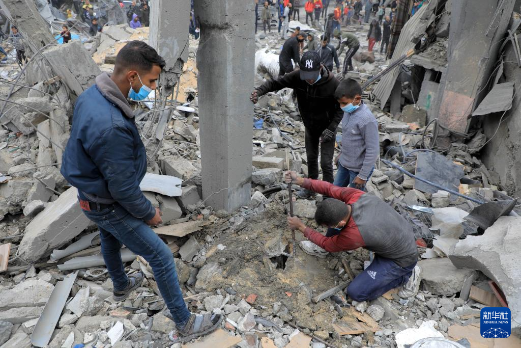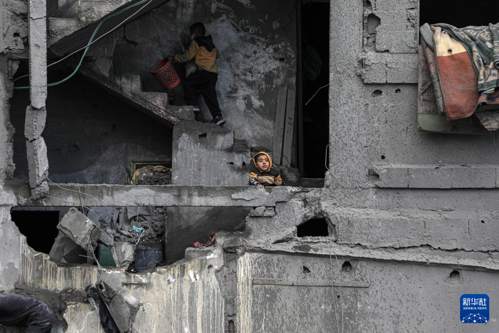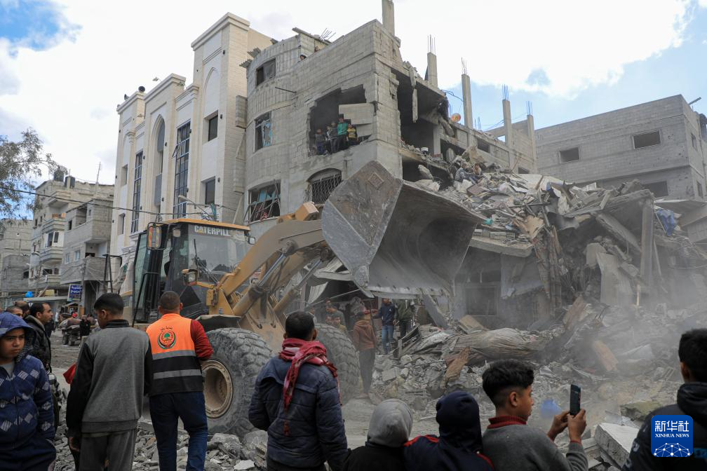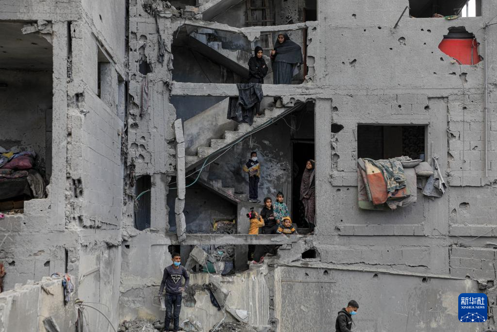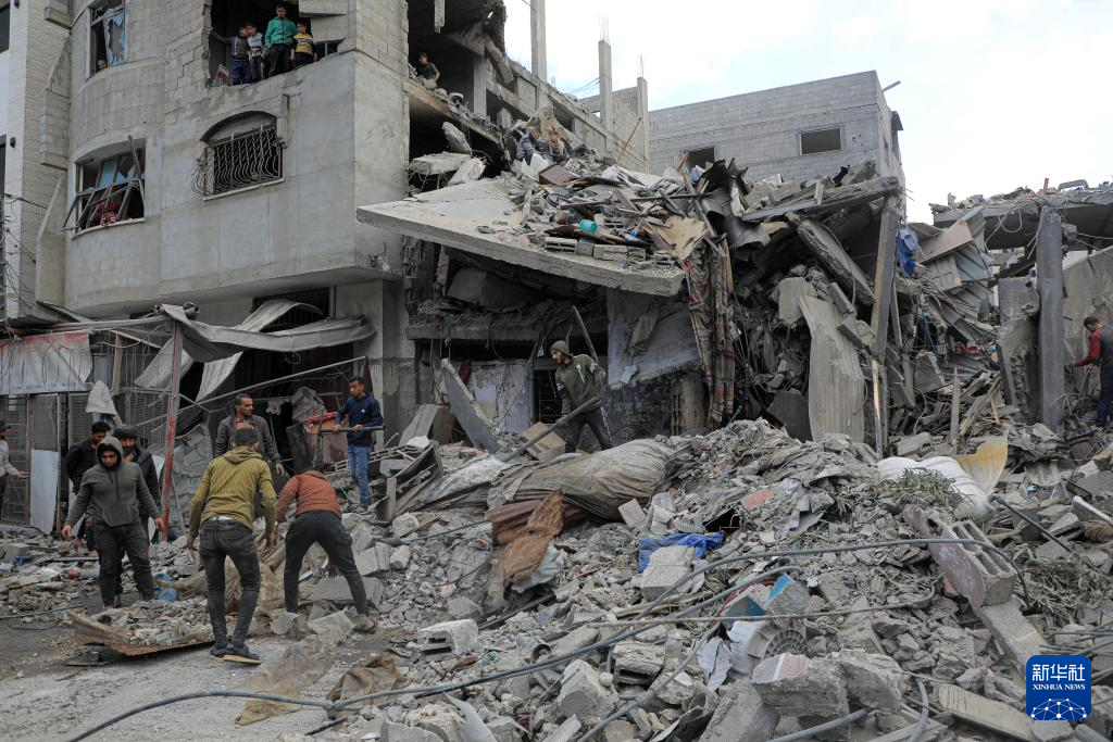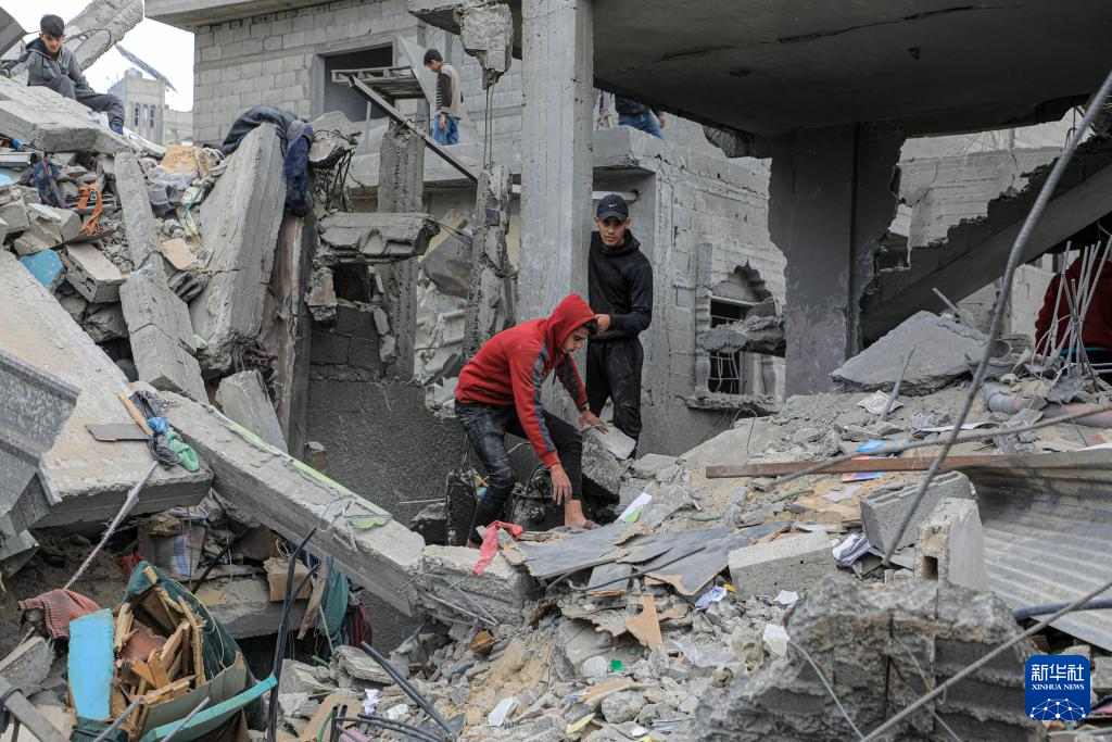 2月22日,在加沙地带南部城市拉法,巴勒斯坦人查看以军空袭后的废墟。