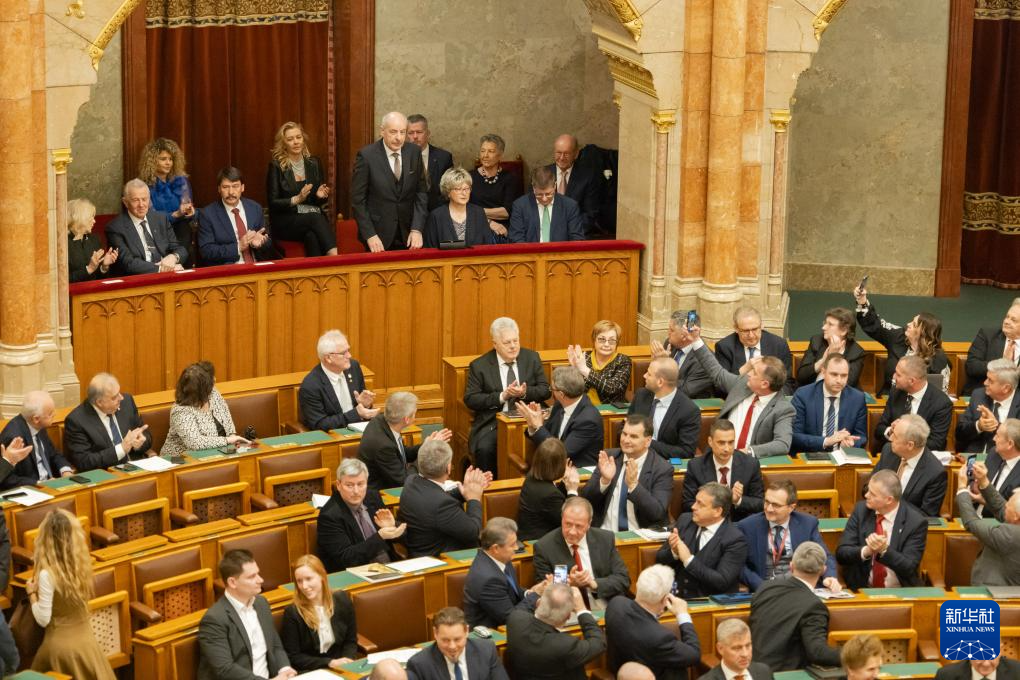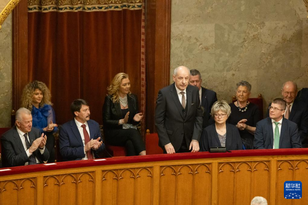 2月26日,在匈牙利布达佩斯,匈牙利当选总统舒尤克·道马什(后中)接受祝贺。