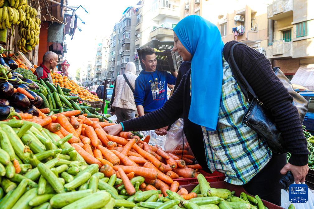 3月11日,人们在埃及首都开罗的一个市场购买食品。