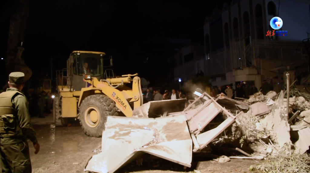 新华社记者在现场看到,遭袭建筑被完全炸毁,废墟上仍有浓烟冒出。当地救援人员正在现场清理废墟,伊朗大使馆附近建筑也在袭击中受损。
