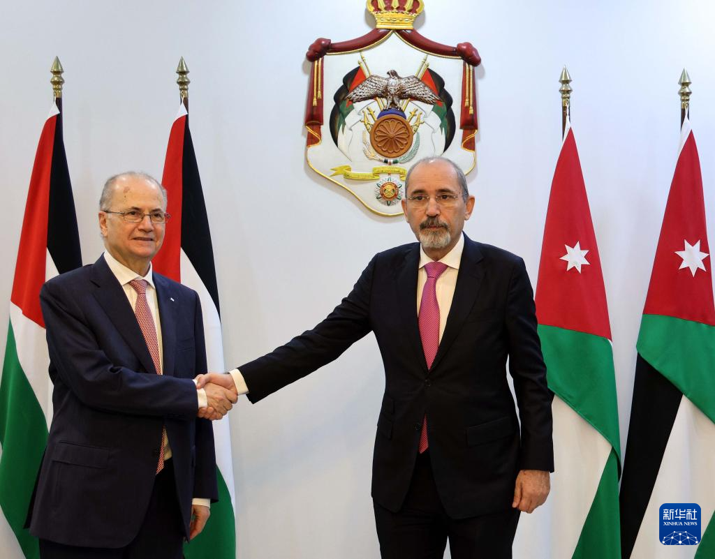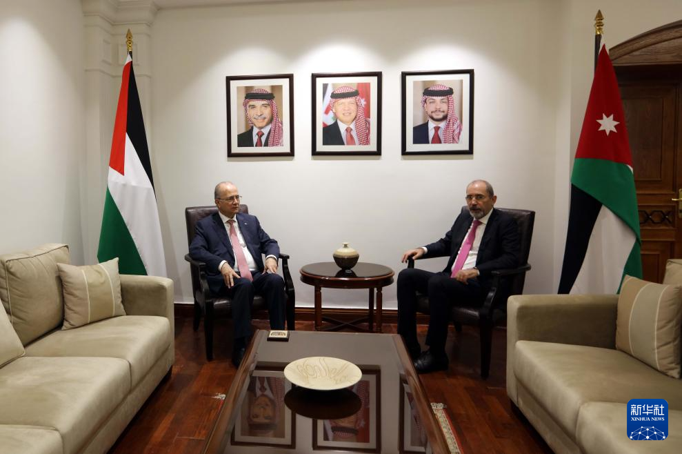 4月7日,在约旦首都安曼,约旦外交大臣艾曼·萨法迪(右)会见巴勒斯坦总理兼外交和侨民事务部长穆罕默德·穆斯塔法。