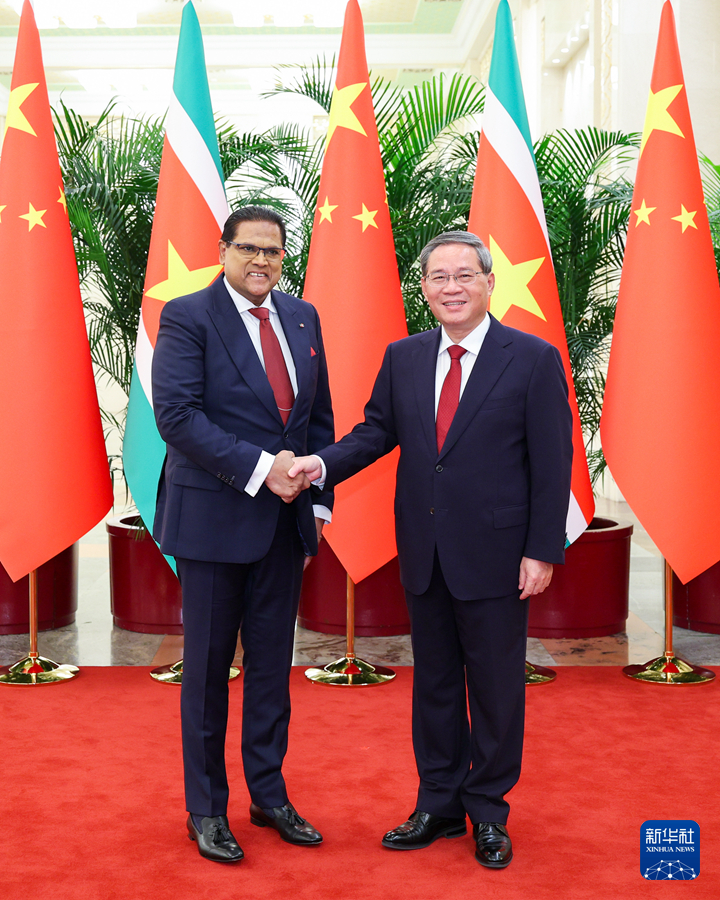 4月12日上午,国务院总理李强在北京人民大会堂会见来华进行国事访问的苏里南总统单多吉。新华社记者 刘彬 摄