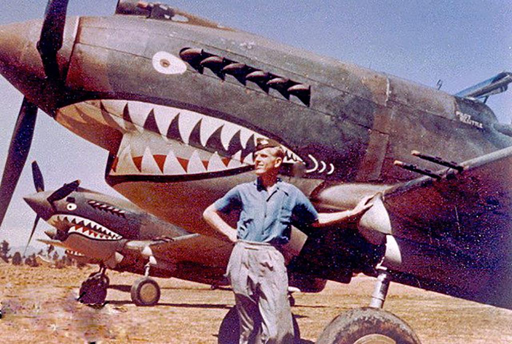 这是在二战时期的昆明巫家坝机场,一名“飞虎队”队员在涂装有“鲨鱼嘴”标志的战斗机前留影的资料照片。新华社发