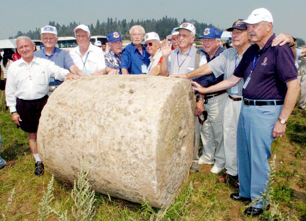 2005年9月10日,在中国昆明呈贡机场,美国“飞虎队”老兵和“飞虎队”访华团成员在二战期间修机场时用于碾压跑道的石碾前合影。(新华社记者王长山摄)