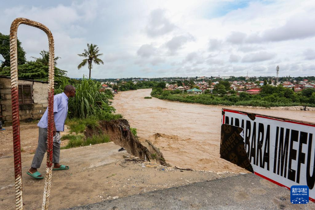 4月24日,在坦桑尼亚达累斯萨拉姆郊区,一名男子查看道路因洪水冲毁情况。
