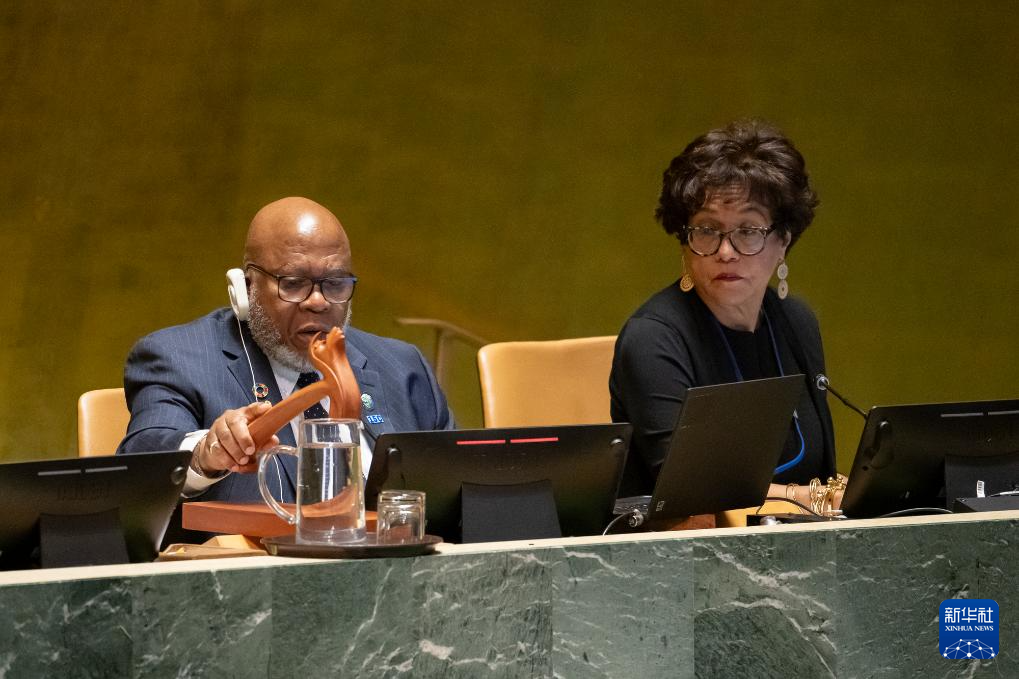 5月10日,在位于纽约的联合国总部,联大主席丹尼斯·弗朗西斯(左)落锤宣布决议通过。