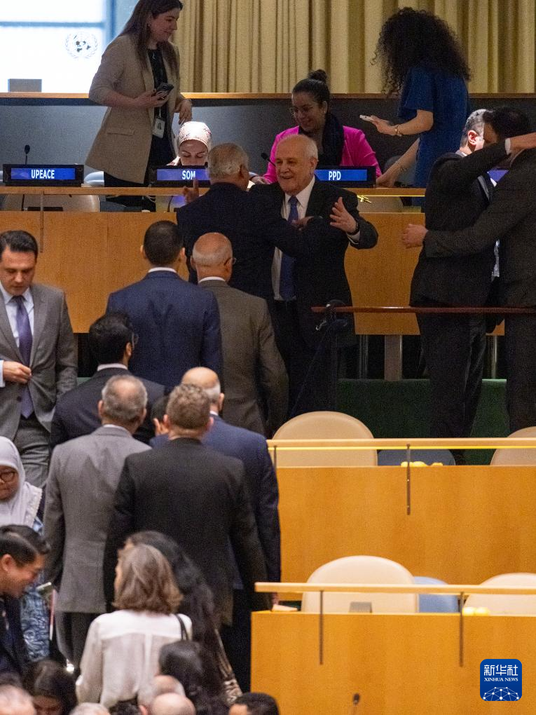 5月10日,在位于纽约的联合国总部,巴勒斯坦常驻联合国观察员曼苏尔(台阶上,面对镜头)在决议通过后接受祝贺。