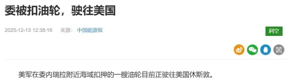 就在2025年12月,美国升级对委内瑞拉的压力,直接在委内瑞拉海岸附近扣押一艘载有约200万桶原油的超级油轮“Skipper”号。目前,该油轮已经被美军控制,正在驶往美国休斯敦。
