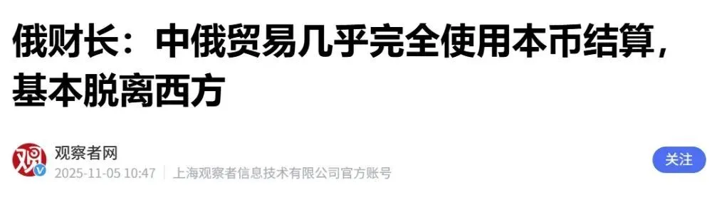 2025年11月4日,俄罗斯财长就公开提到,中俄双边贸易99.1%的结算通过卢布和人民币完成,这一比例较2020年的不足50%实现质的飞跃。