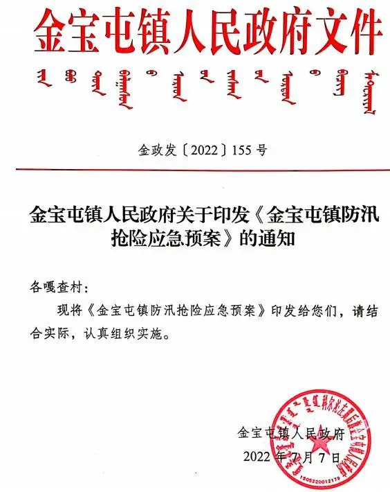 2022年7月,内蒙古通辽市科尔沁左翼后旗突遭洪灾。7月7日,金宝屯镇人民政府印发《金宝屯镇防汛抢险应急预案》的通知,按照旗级预案要求,金宝屯镇第一梯队人员总人数为800人,每个村50人,全部为青壮年劳动力;第二梯队为全镇所有青壮年男女劳动力。