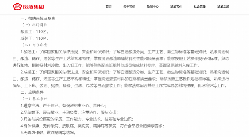 近日,山西杏花村汾酒集团有限责任公司(下称“汾酒集团”)公示的生产一线技术工人招聘拟录用人员名单中,酿酒工和成装工岗位出现多名硕士研究生,消息引发热议。