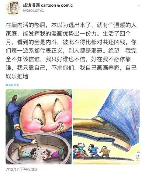 这个“成涛漫画”和乔木差不多前后脚到的美国。和乔木对美国客观现实失望不同的是,“成涛漫画”更多是对在美国的“队友”内讧感到不满,对视美国为“自由之地”,将“推墙”视为己任的“成涛漫画”来说,这或许是更深层次的失望。