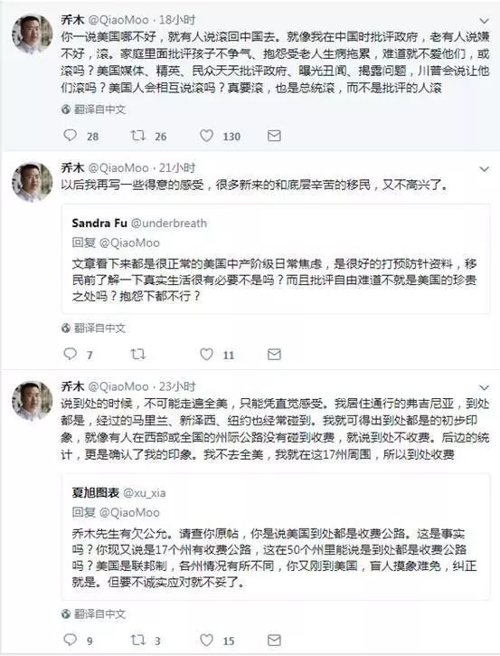 除了质疑乔木观察美国的视角和结论,还有些人干脆直言:既然说美国不好,不如滚回中国。乔木后来陆续发了不少推特,就具体问题逐一解释、回应各种疑问。