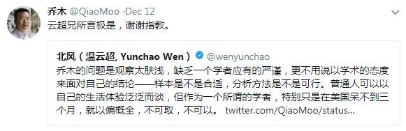 从乔木的推特上,我们能看到一个叫北风(温云超)的人对乔木的批评,温云超的言辞毫不客气,堪称激烈。而乔木对温云超批评的回应,温顺得像一头小猫。所谓北风(温云超)是十分活跃的铁杆海外反华分子,从这个截图能看出,两人相识。