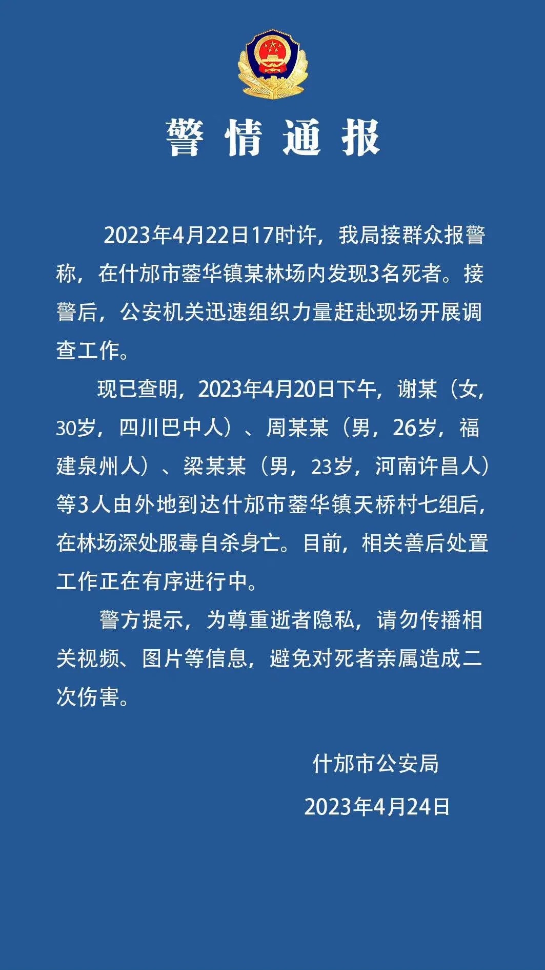 现已查明,2023年4月20日下午,谢某(女,30岁,四川巴中人)、周某某(男,26岁,福建泉州人)、梁某某(男,23岁,河南许昌人)等3人由外地到达什邡市蓥华镇天桥村七组后,在林场深处服毒自杀身亡。目前,相关善后处置工作正在有序进行中。警方提示,为尊重逝者隐私,请勿传播相关视频、图片等信息,避免对死者亲属造成二次伤害。