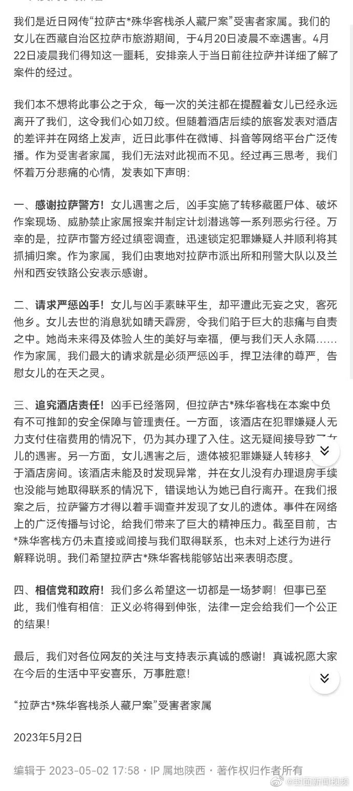 近日,一网友称,其入住拉萨某客栈时床下发现尸体。警方随后通报,4月21日在该客栈发现被害人遗体,后在火车上抓获嫌疑人高某。5月2日,疑似“拉萨客栈杀人案”受害者家属发声,认为虽然凶手已经落网,但拉萨古*殊华客栈在本案中负有不可推卸的安全保障与管理责任。一方面,该酒店在嫌疑人无力支付住宿费用的情况下,仍为其办理了入住。另一方面,女儿遇害之后,遗体被嫌疑人转移并藏匿于酒店房间,但该酒店未能及时发现异常,并在女儿没有办理退房手续,也没能与她取得联系的情况下,错误地认为她已自行离开。