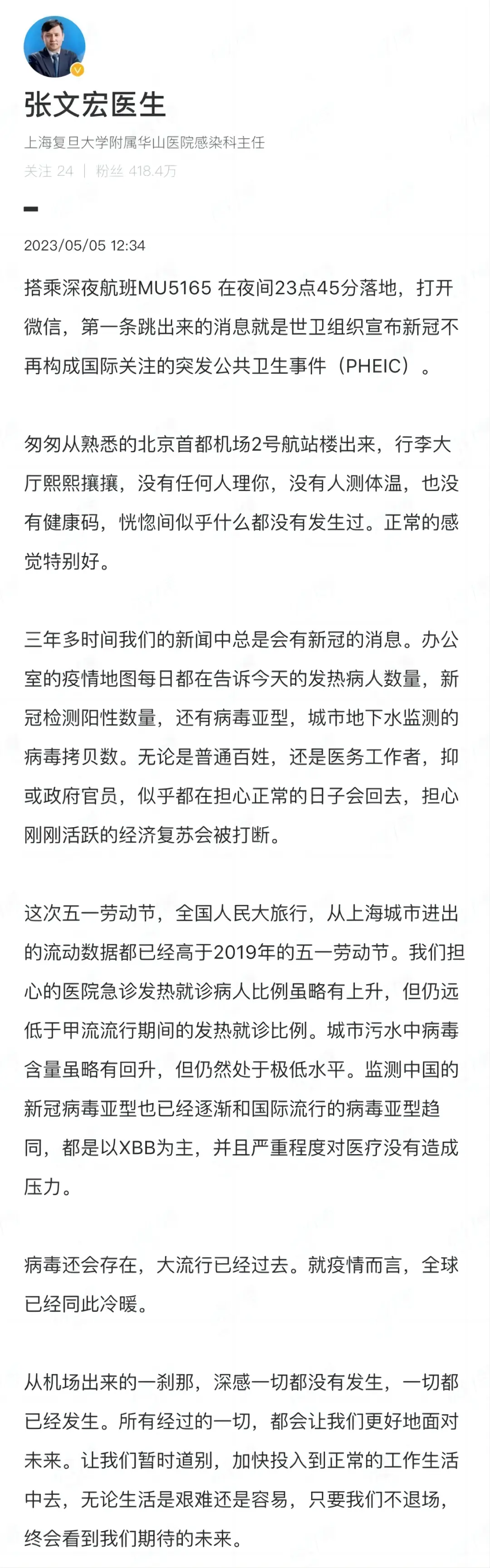 5月6日,华山医院感染科主任张文宏在微博撰文称:“这次五一劳动节,全国人民大旅行,从上海城市进出的流动数据都已经高于2019年的五一劳动节。我们担心的医院急诊发热就诊病人比例虽略有上升,但仍远低于甲流流行期间的发热就诊比例。城市污水中病毒含量虽略有回升,但仍然处于极低水平。监测中国的新冠病毒亚型也已经逐渐和国际流行的病毒亚型趋同,都是以XBB为主,并且严重程度对医疗没有造成压力。