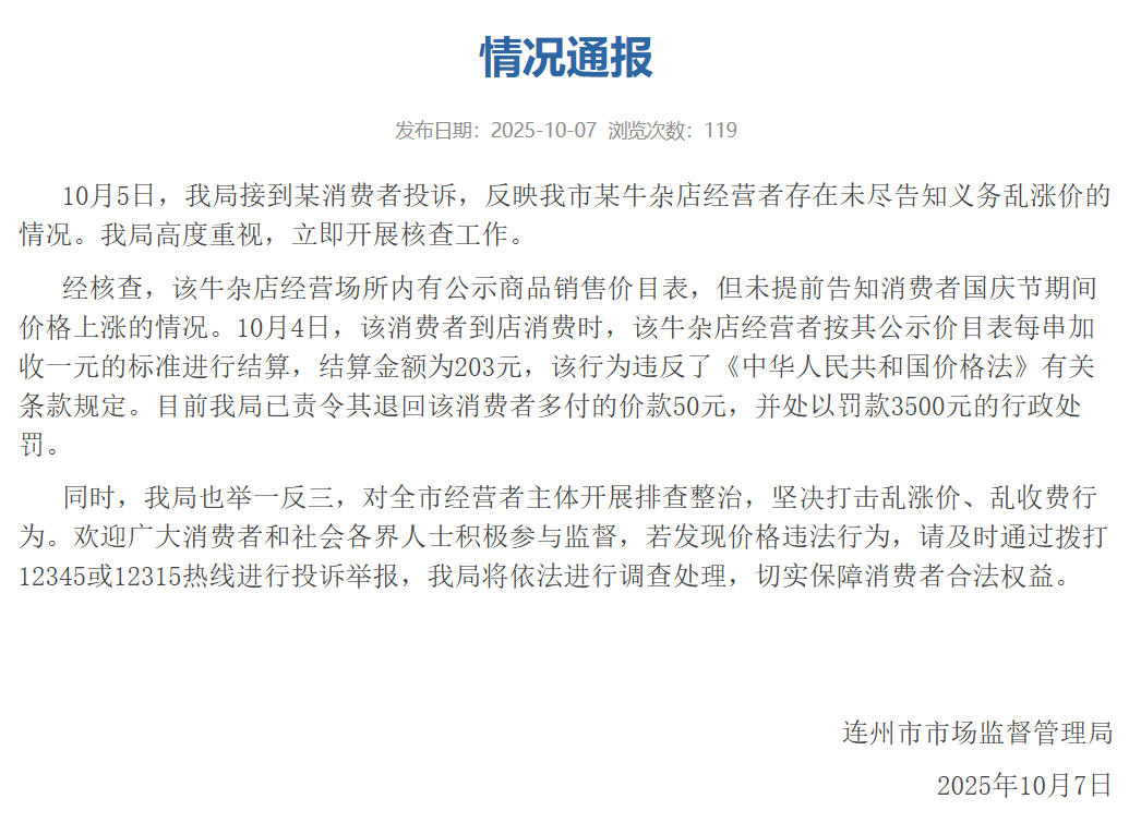 经核查,该牛杂店经营场所内有公示商品销售价目表,但未提前告知消费者国庆节期间价格上涨的情况。10月4日,该消费者到店消费时,该牛杂店经营者按其公示价目表每串加收一元的标准进行结算,结算金额为203元,该行为违反了《中华人民共和国价格法》有关条款规定。目前连州市市场监督管理局已责令其退回该消费者多付的价款50元,并处以罚款3500元的行政处罚。