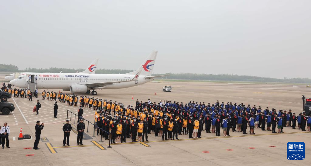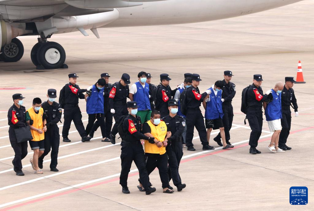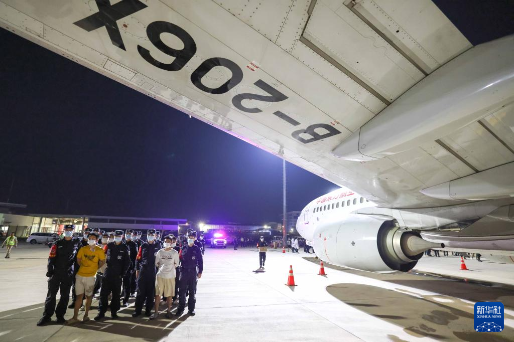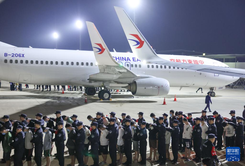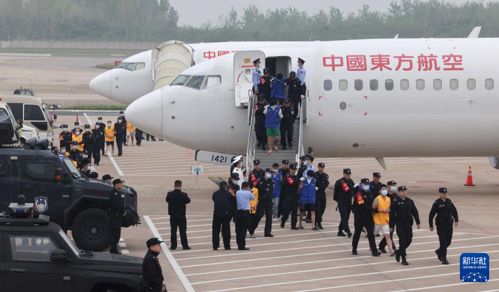 4月13日,柬埔寨金边国际机场,中国籍涉赌诈违法犯罪嫌疑人被我公安机关押解回国。4月13日晨,随着两架中国民航包机降落在湖北武汉天河国际机场,首批130名中国籍涉赌诈违法犯罪嫌疑人被我公安机关从柬埔寨押解回国。这是今年以来中柬警方组织开展的首批遣返押解任务,拉开了两国警方联合打击涉赌诈违法犯罪的帷幕。新华社记者 殷刚 摄