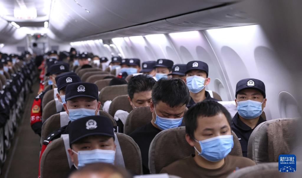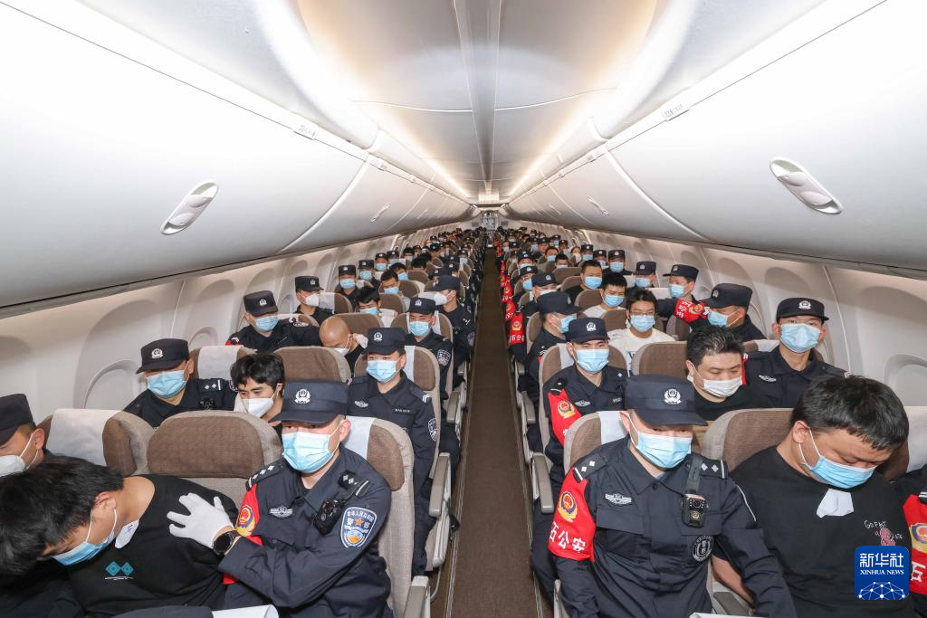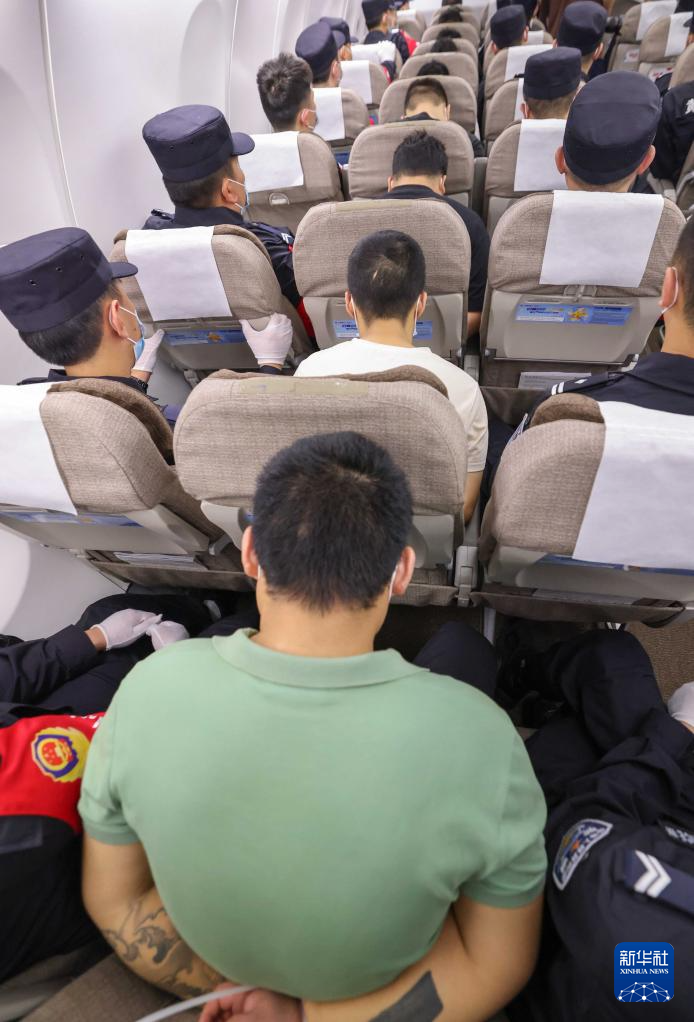 4月13日,中国籍涉赌诈违法犯罪嫌疑人被我公安机关押解上回国包机。新华社记者 殷刚 摄