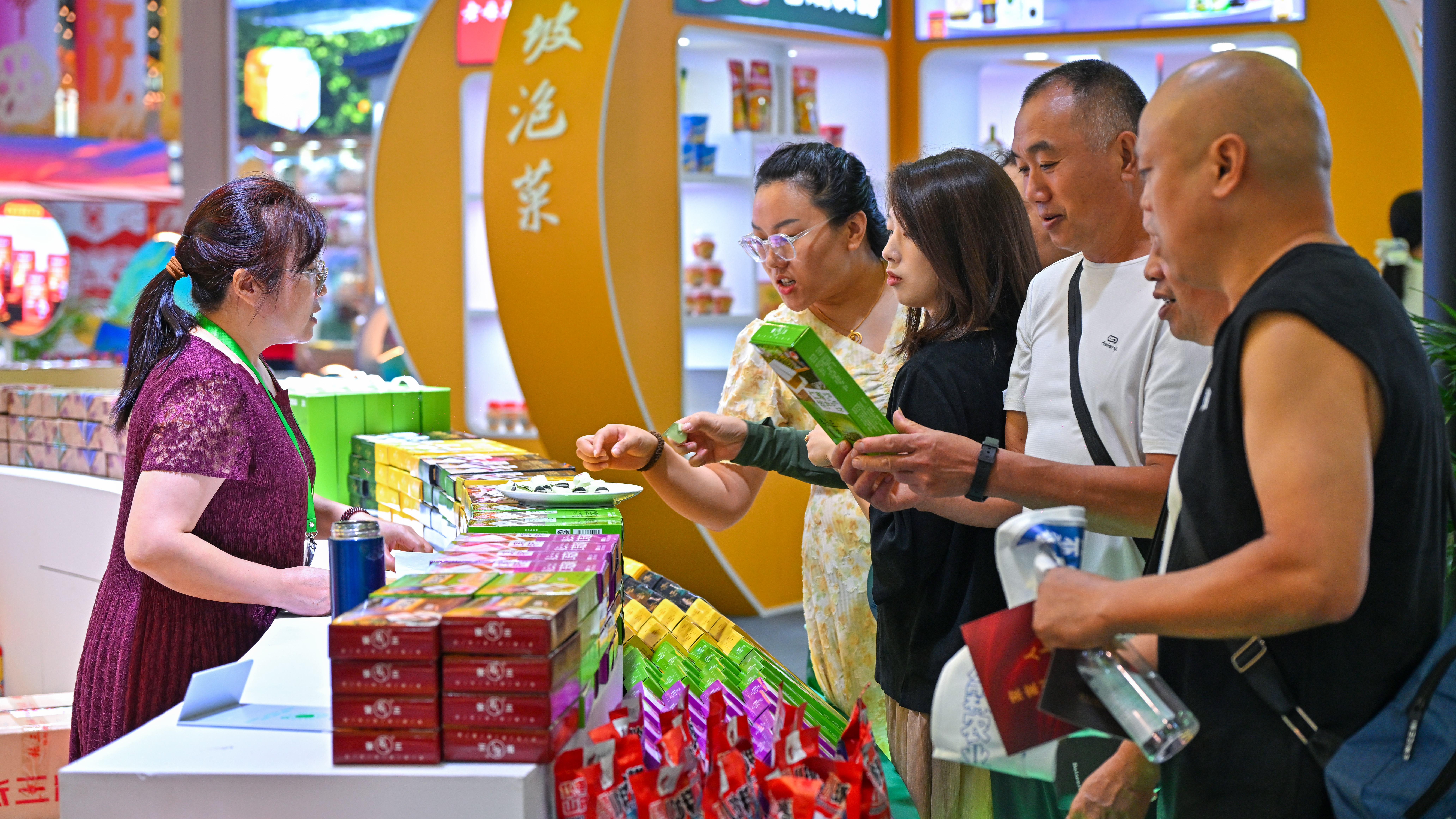 走进成都世纪城新国际会展中心2号馆的仁寿展区,具有地域特色的布置格外吸睛,展柜上产品丰富多样。四川蜀作电子商务有限公司展位前,现场烹制的腊味香气扑鼻,引得食客纷纷驻足;四川厨丰食品有限公司的多样调味品一字排开,让人眼花缭乱……整个展区内,参观、试吃、询价、洽谈的人群络绎不绝、人气十足。