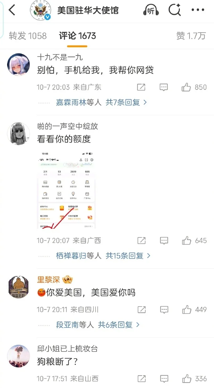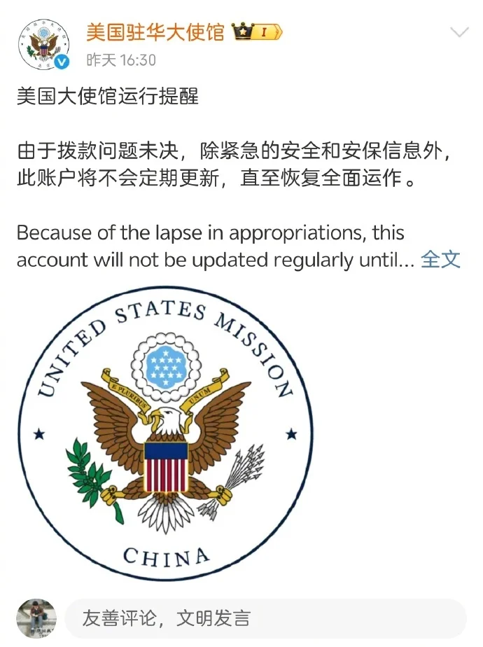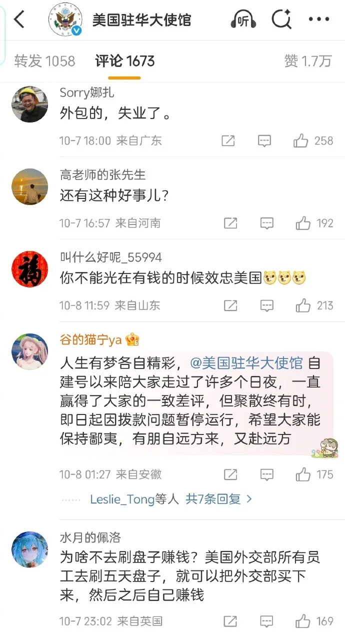 美国驻华大使馆宣布停更微博微信,送来个大乐子,评论区被涌入的网友们刷成了这样