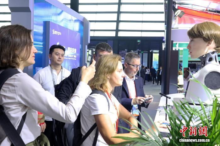 11月6日,2025年“互联网之光”博览会上,国际友人与机器人进行互动。中新社记者 胡丰盛 摄