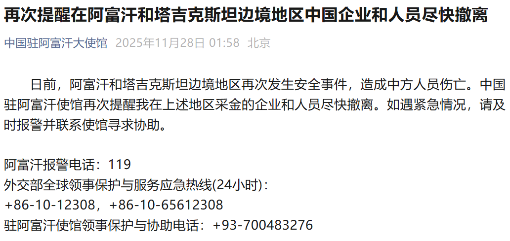 日前,阿富汗和塔吉克斯坦边境地区再次发生安全事件,造成中方人员伤亡。中国驻阿富汗使馆再次提醒我在上述地区采金的企业和人员尽快撤离。如遇紧急情况,请及时报警并联系使馆寻求协助。