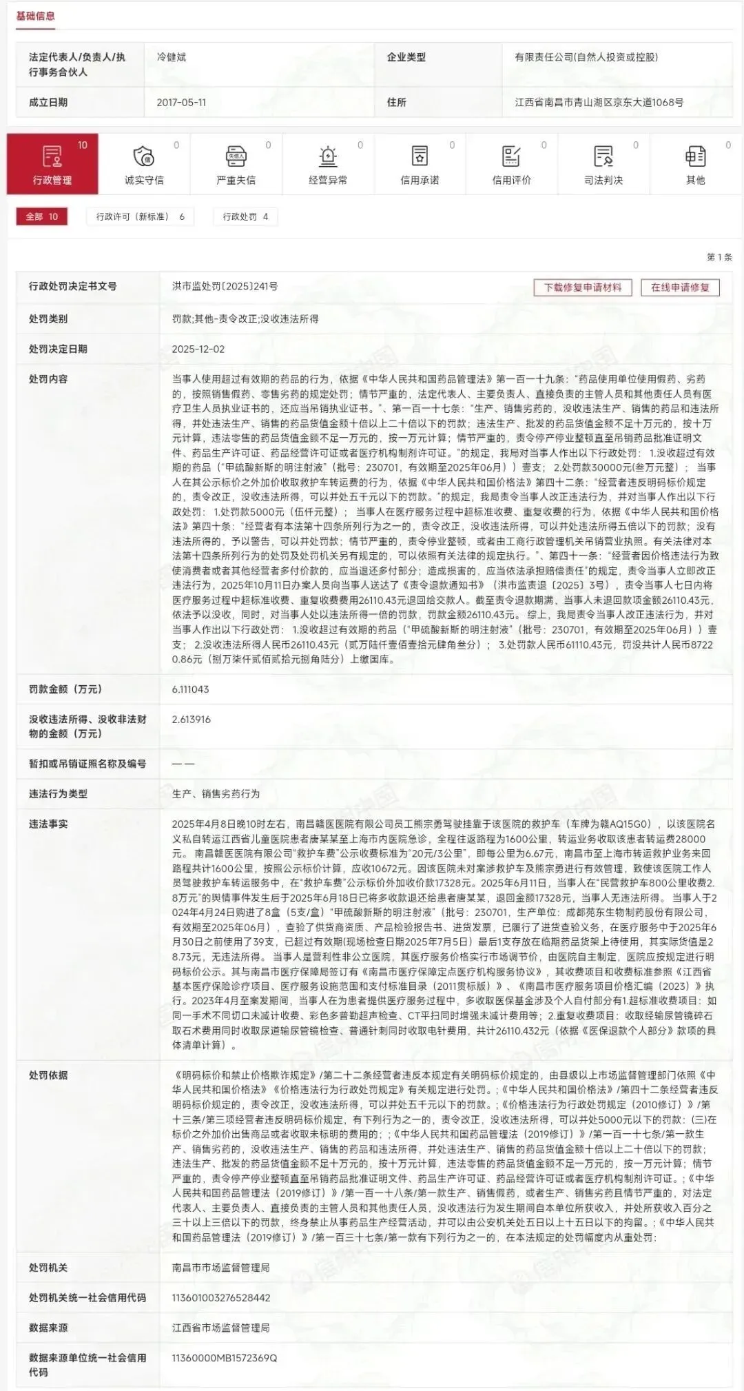 南昌市市场监督管理局对涉事的南昌赣医医院有限公司作出处罚