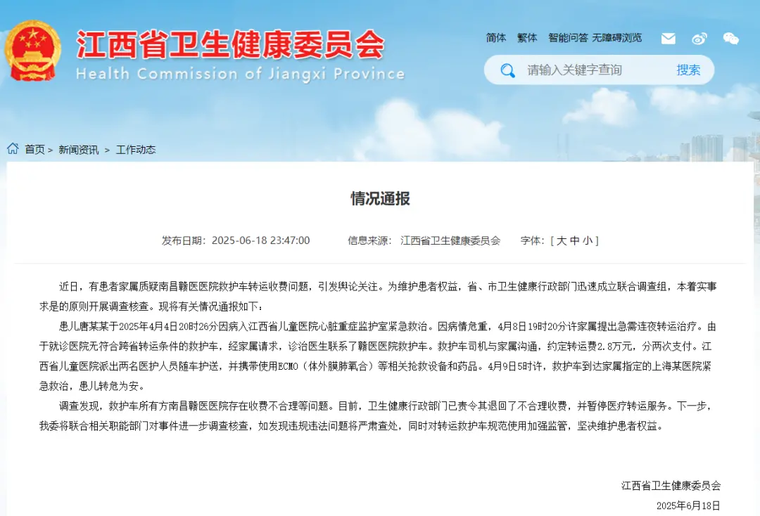 江西省卫健委2025年6月18日关于“天价救护车”事件发布的情况通报