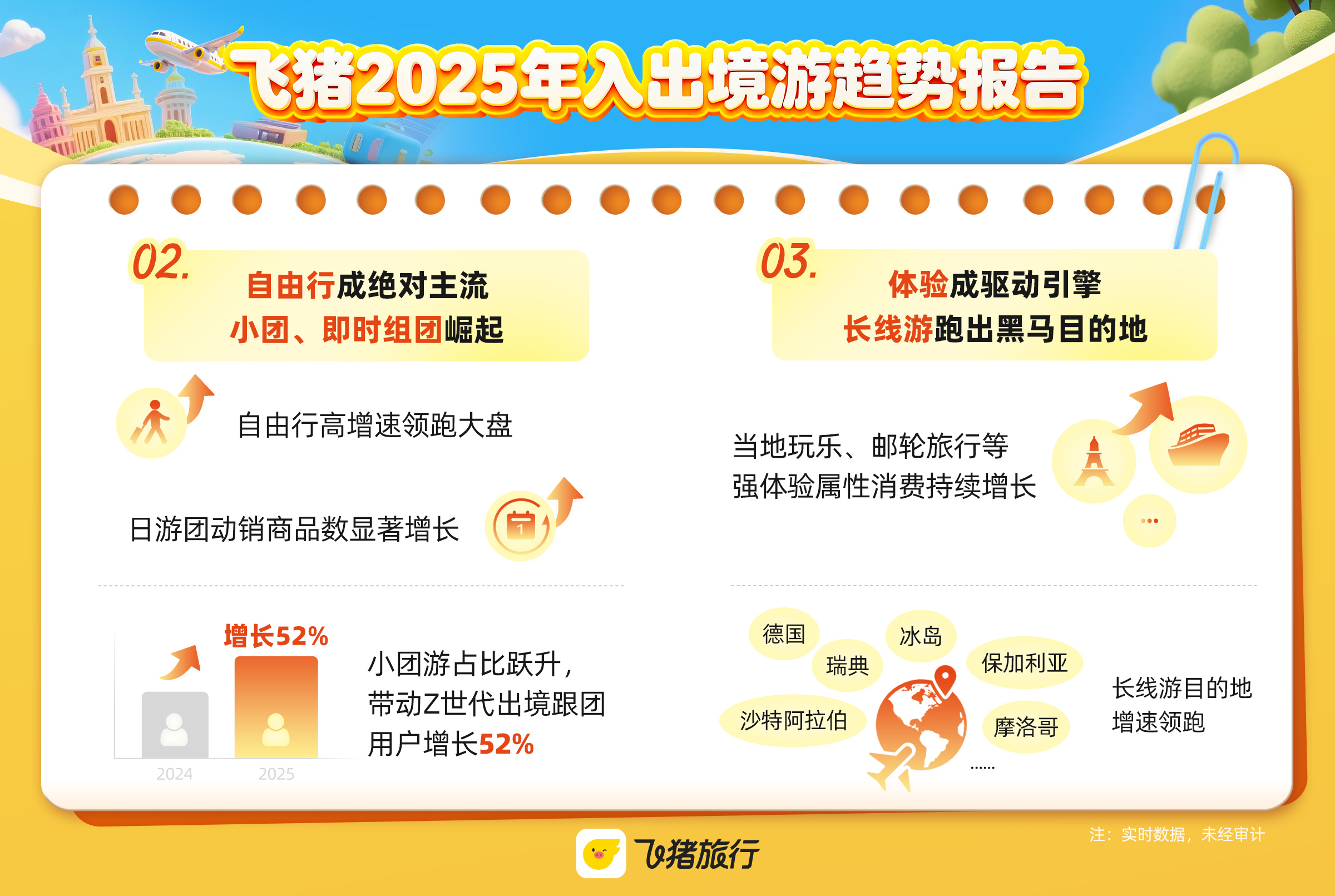 飞猪数据显示,2025年平台上小团类商品在出境跟团游商品整体履约金额中的占比显著增长。这些小团规模介于私家团和传统出境游大团之间,性价比高,较传统大团又更注重吃、住、玩的体验,有更多自由活动时间。小团化的趋势甚至带动了Z世代消费者跟着旅行团出境旅行的热情,2025年通过飞猪完成一次出境跟团旅行的Z世代用户数同比增长约52%。