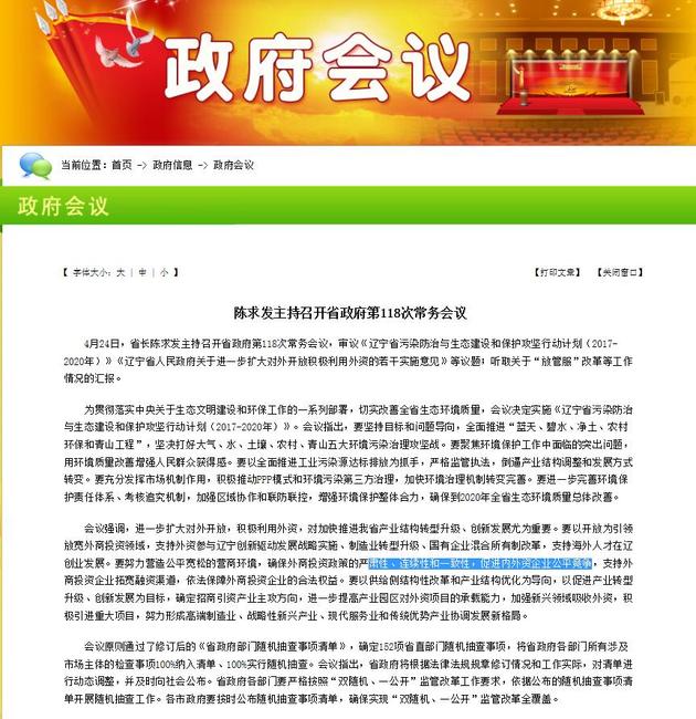 4月24日,省长陈求发主持召开省政府第118次常务会议,审议《辽宁省污染防治与生态建设和保护攻坚行动计划(2017-2020年)》《辽宁省人民政府关于进一步扩大对外开放积极利用外资的若干实施意见》等议题;听取关于“放管服”改革等工作情况的汇报。