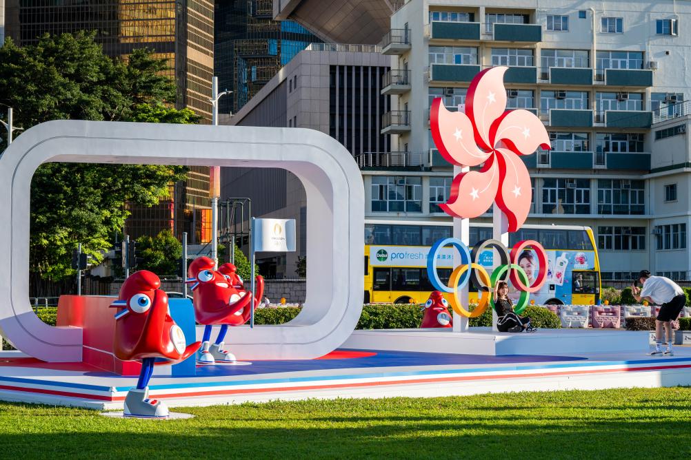 7月9日,人们在香港金钟添马公园内的巴黎奥运主题装置旁拍照留念。新华社记者 朱炜 摄