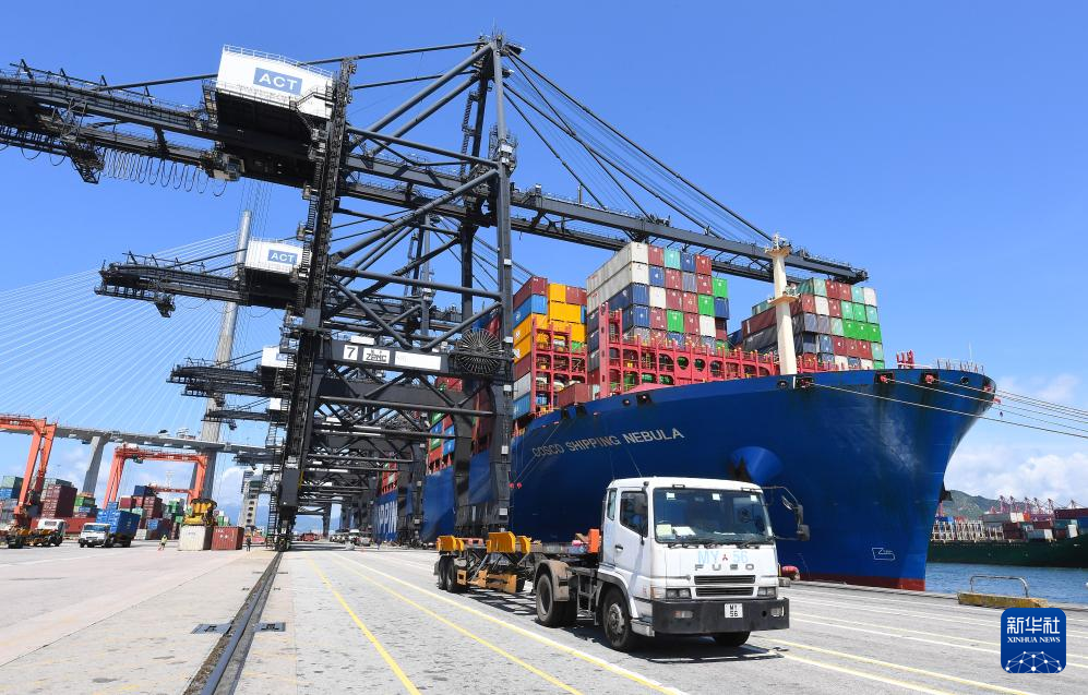 一艘货轮在香港货柜码头装货(5月22日摄)。新华社记者 陈铎 摄