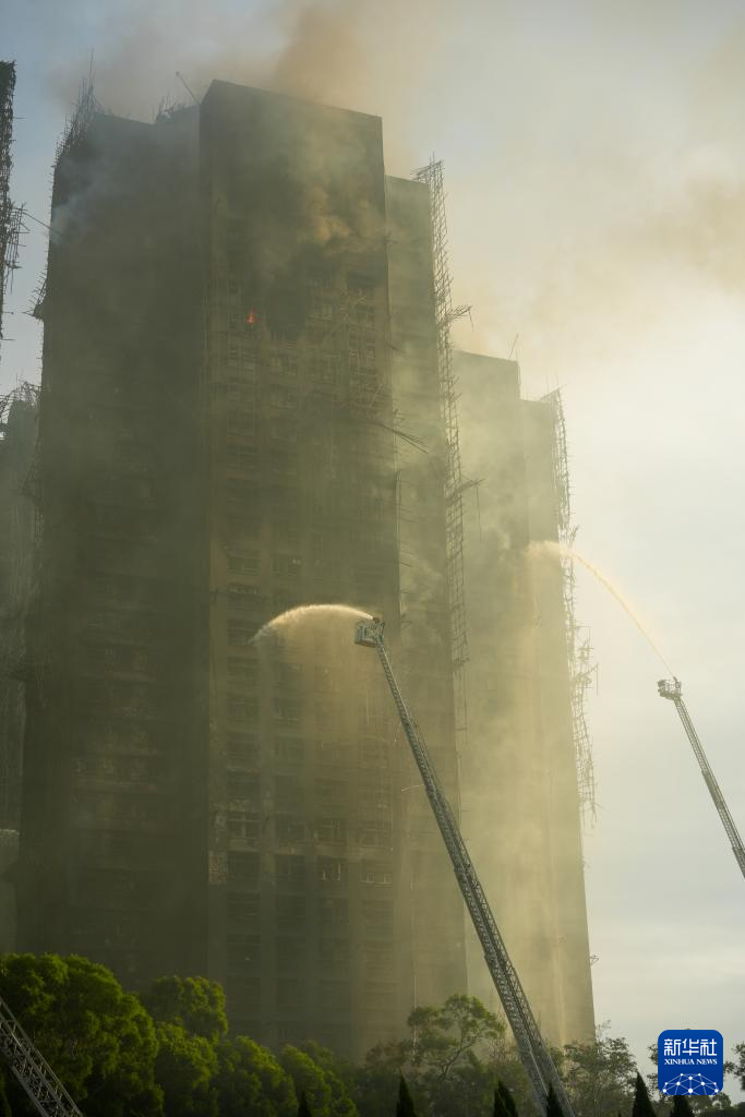 11月27日拍摄的香港大埔屋邨宏福苑火灾救援现场。新华社记者 朱炜 摄
