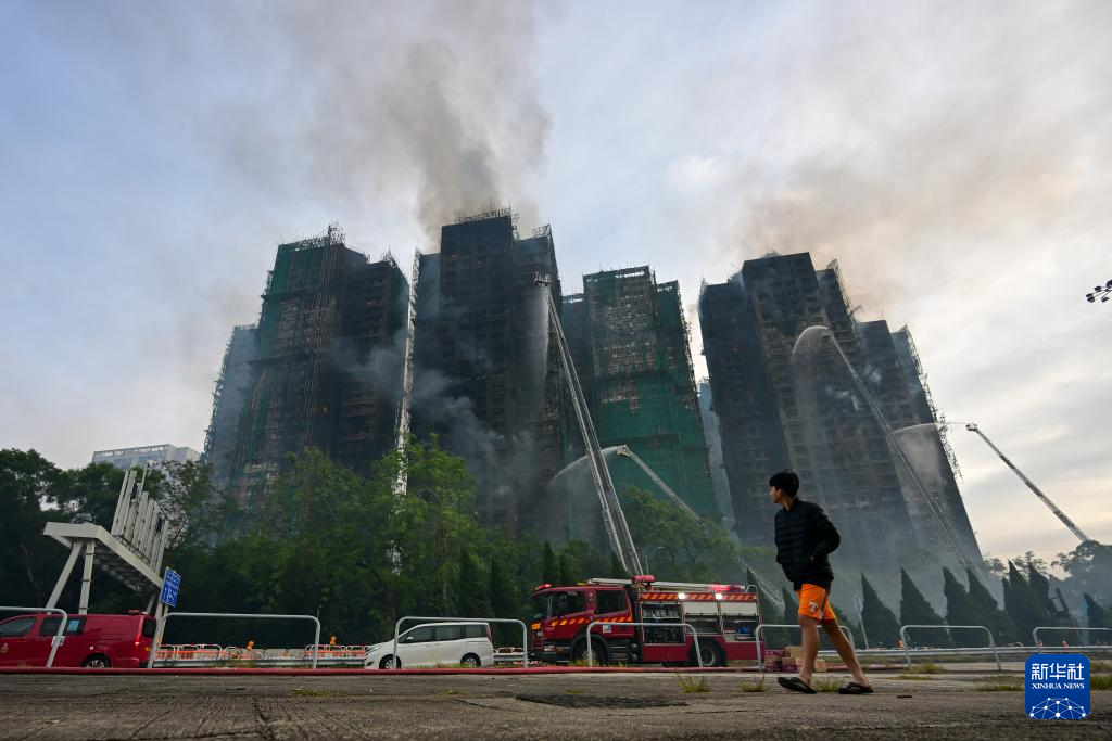 11月27日,行人从香港大埔屋邨宏福苑火灾现场附近走过。11月27日凌晨,香港警方和消防部门召开记者会宣布,大埔屋邨宏福苑火灾目前已造成44人遇难,45人受伤。警方已拘捕3名涉嫌误杀的男子。新华社记者 朱炜 摄